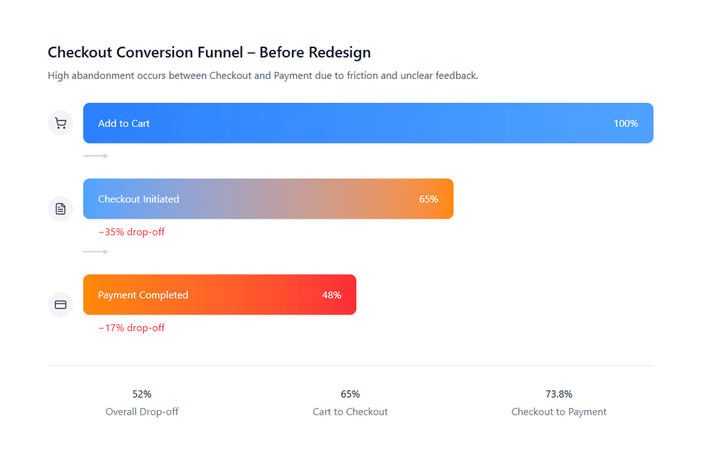 Users reported frustration with unclear form errors, hidden fees, and failed payments without guidance.