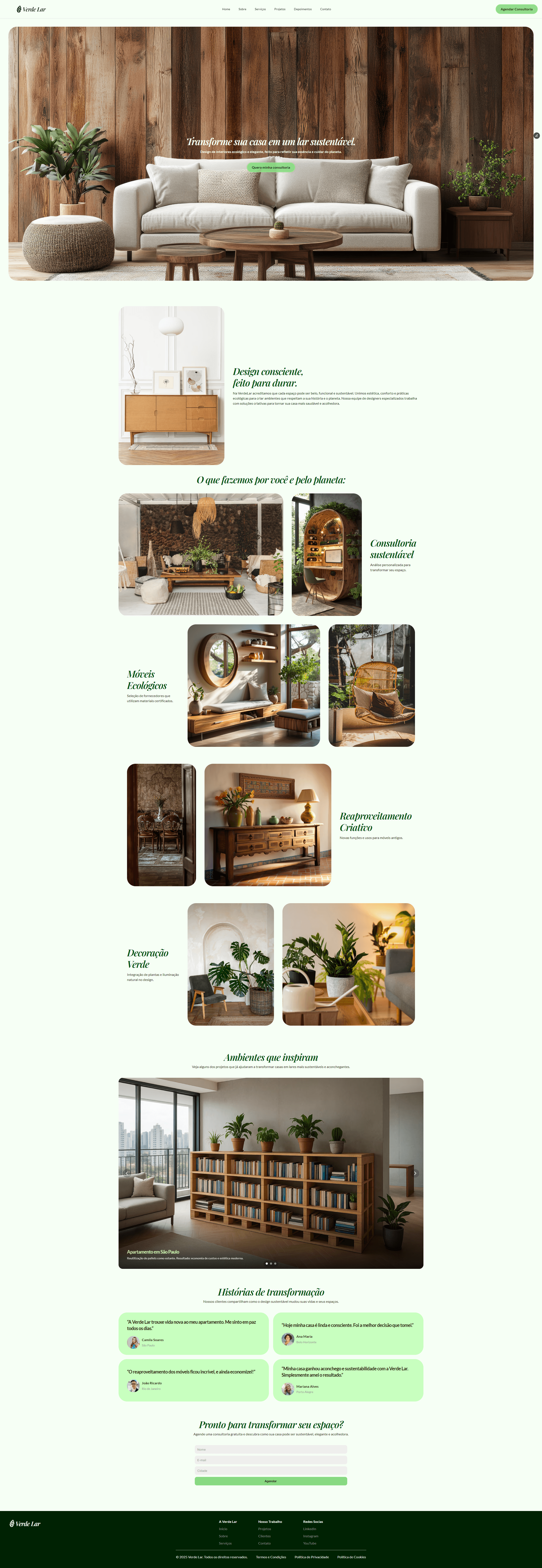 The creative process for VerdeLar’s landing page started with a clear definition of the brand identity and its sustainable values. A simple wireframe was then structured to organize the sections, prioritizing clarity and smooth navigation. The choice of colors and typography aimed to convey sophistication and a connection with nature, while real project images were selected to create proximity and inspire trust.